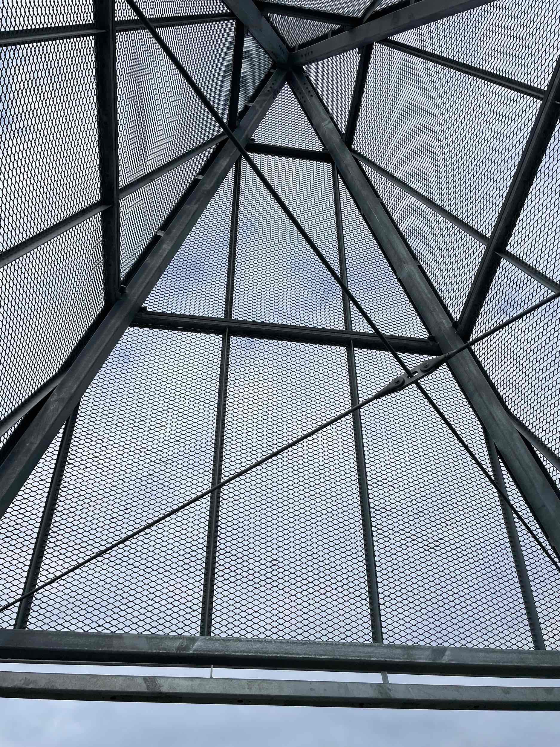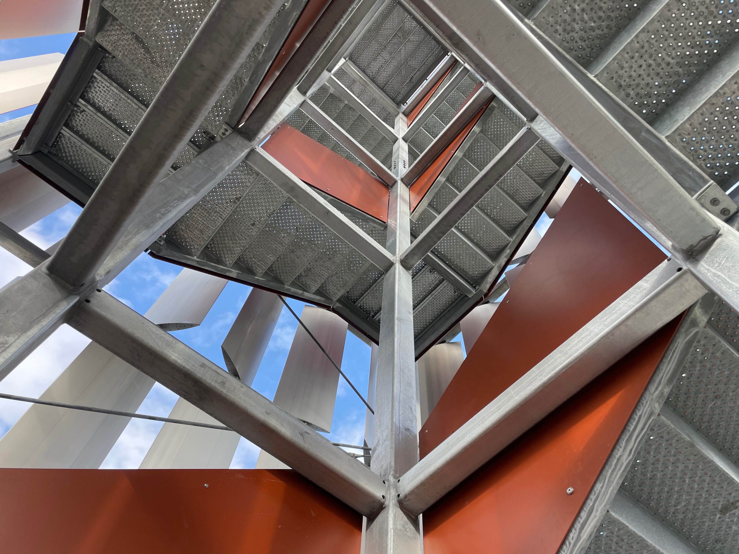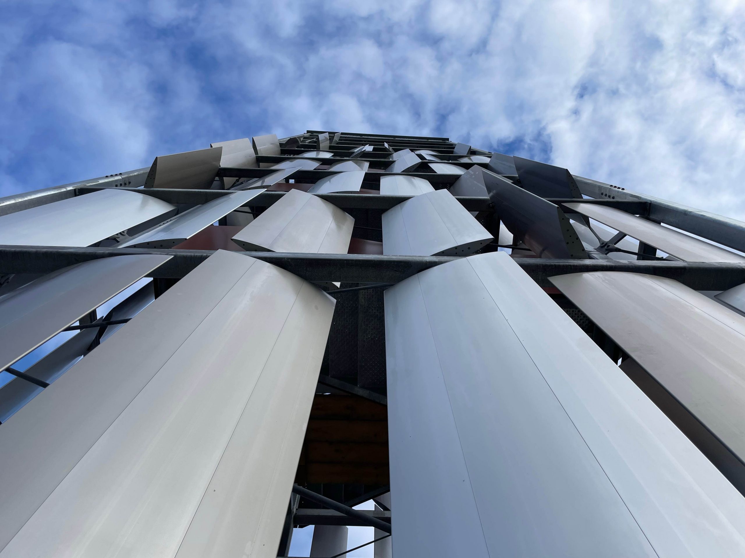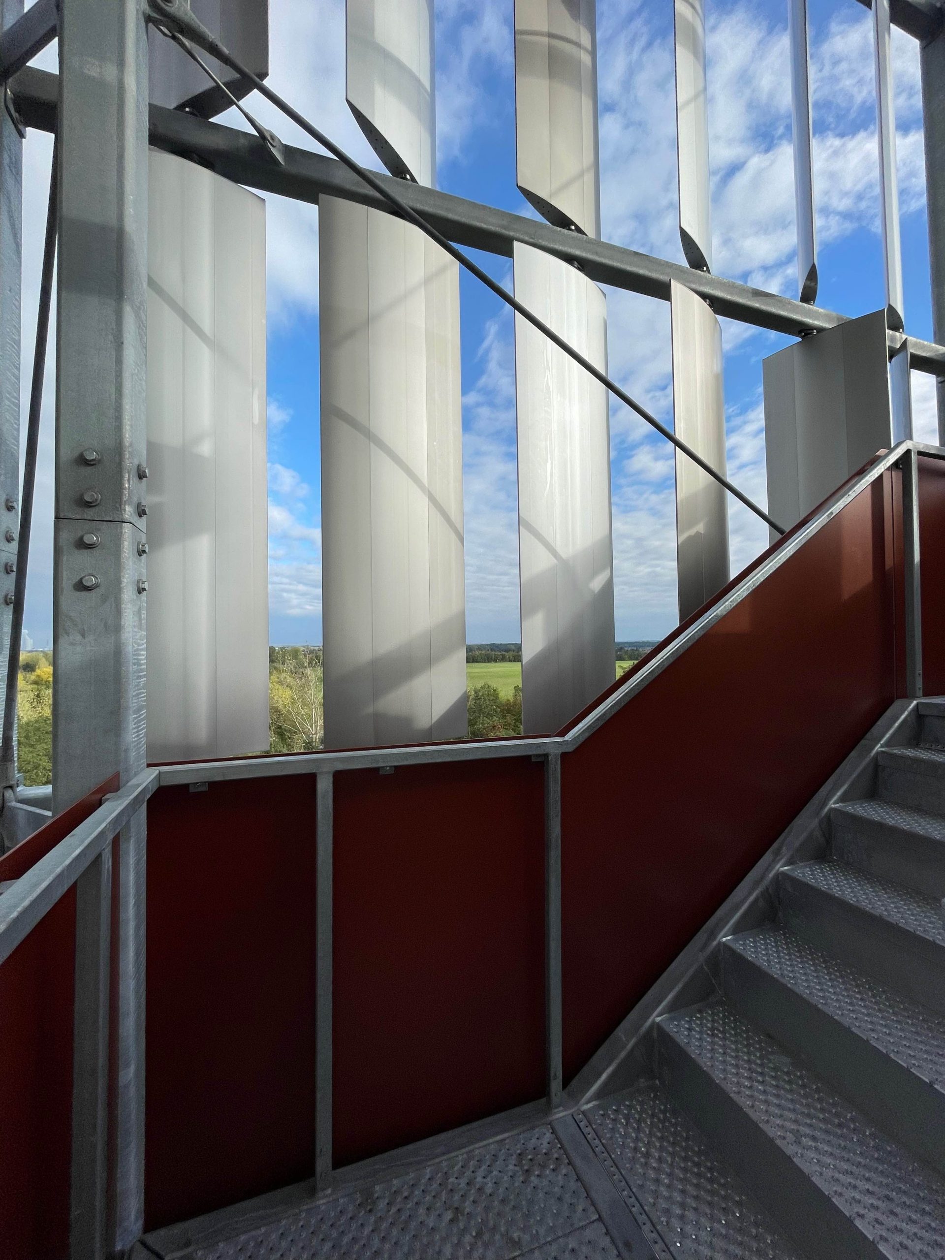 Die in das Traggerüst des Turmes eingesetzten, metallisch glänzenden Paneele verleihen dem Turm etwas Schemenhaftes und Durchscheinendes. Eine Fassade, die sich durch den Wind und die Besucher öffnet und schließt, und so nicht ein klares Volumen umspannt, sondern gleichzeitig Durchsicht und Ansicht gewährt. Stets wandelt sich das Verhältnis von offenen zu geschlossenen Flächen. Das Wechselspiel gibt dem Turm ein sich ständig änderndes Erscheinungsbild, manchmal eher durchsichtig und unscharf, manchmal eher geschlossen und klar in seiner Kontur.
