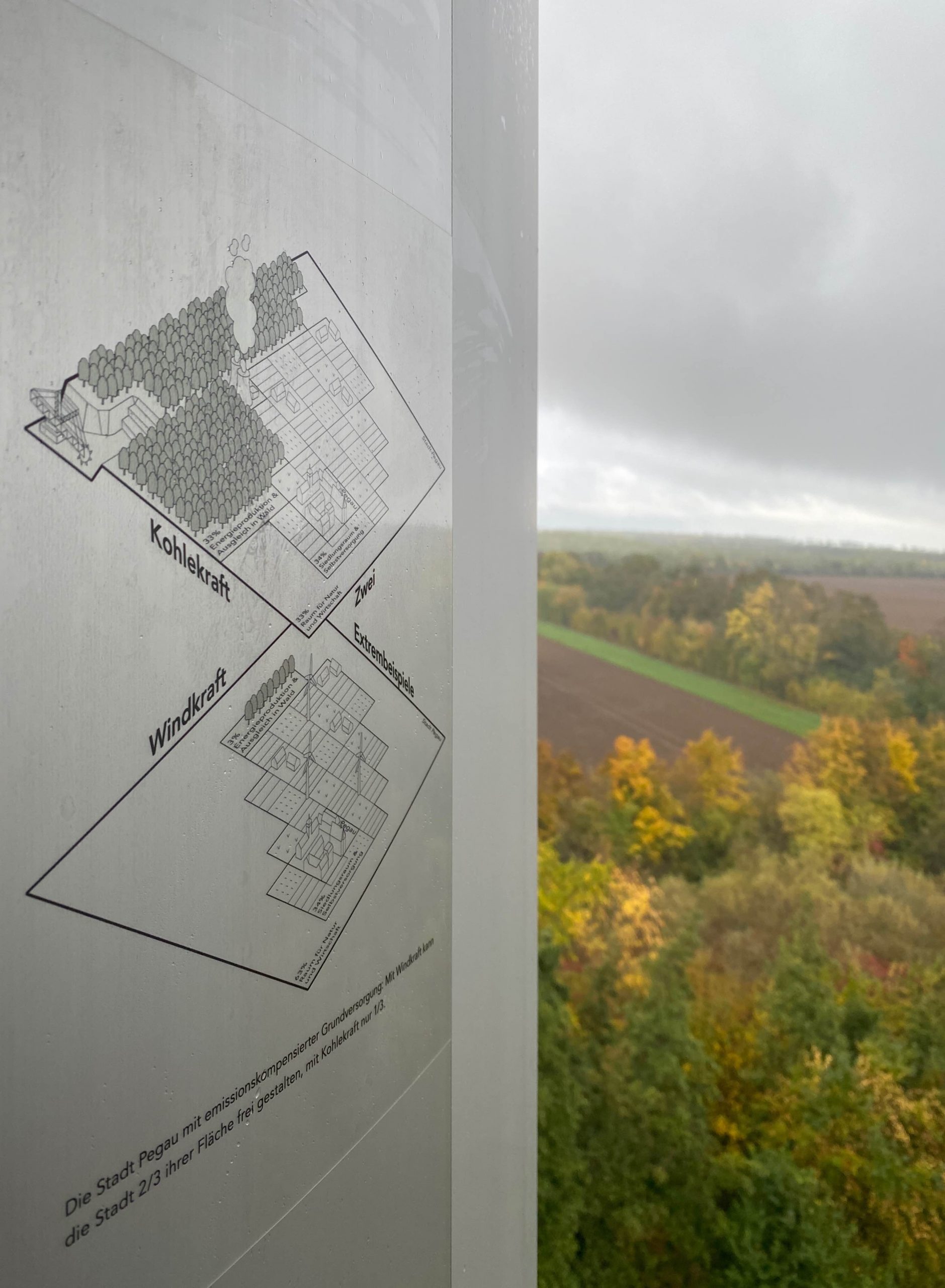 Die Gemeinde Stöntzsch, zwei Kilometer westlich von Pegau, fiel 1960 den Braunkohle-Baggern des Tagebaus Profen zum Opfer. Im Rahmen der Rekultivierung wurde ein Hügel mit einer kleinen, mit Eisenbahnschwellen gefassten Aussichtsplattform angelegt. Da der Aussichtspunkt abgängig war und die aufgewachsene Vegetation die Aussicht verhinderte, beauftragte die Stadt Pegau quartier vier mit dem Entwurf eines Aussichtsturms.