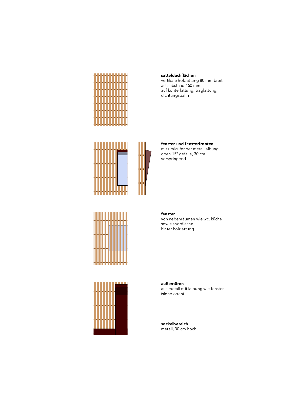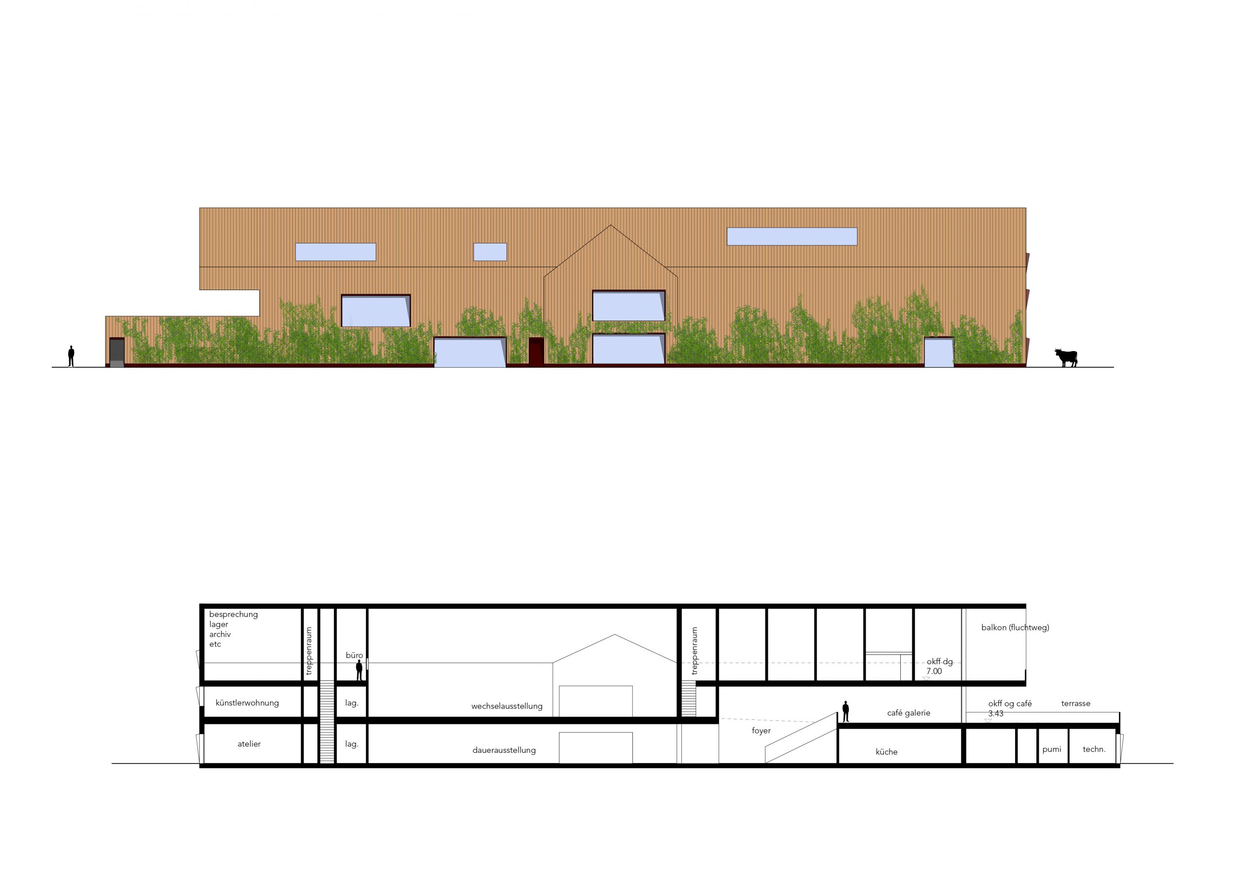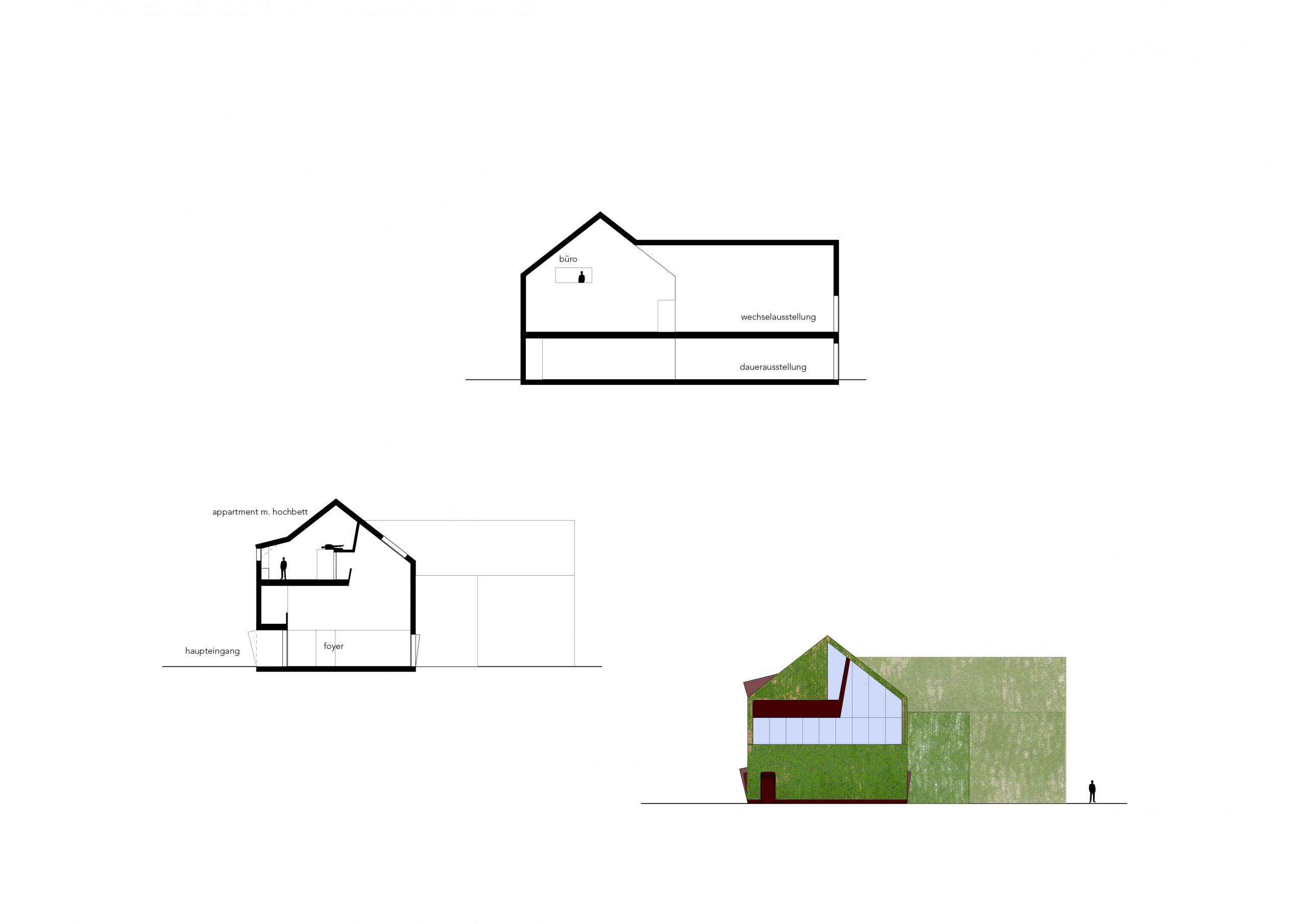 In den archaischen Lattungen an Dach und Fassade löst sich die Strenge des gestreckten Baukörpers. Gleichzeitig dienen sie als Gerüste, an denen Pflanzen das Haus zunehmend beranken können. Gauben, Unter- und Einschnitte, vortretende Laibungen von Türen und Fenstern machen die Fassaden zum Relief zukünftiger Inhalte. Ein luftiges Foyer mit Museumsshop gliedert den Bau in Ausstellungs- und Kaffebereich.