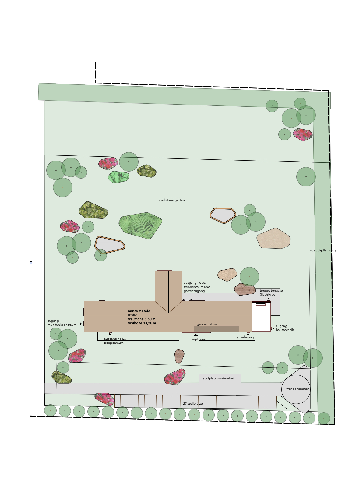 Entwurf eines Kunstmuseums mit Skulpturengarten, Gastronomie und Künstlerwohnungen