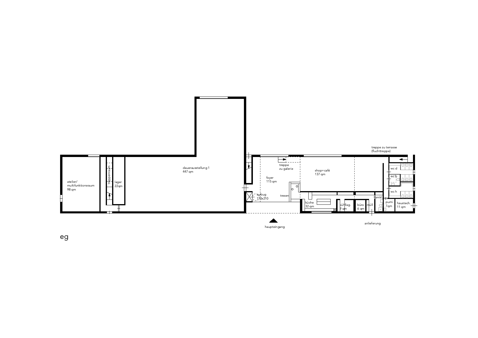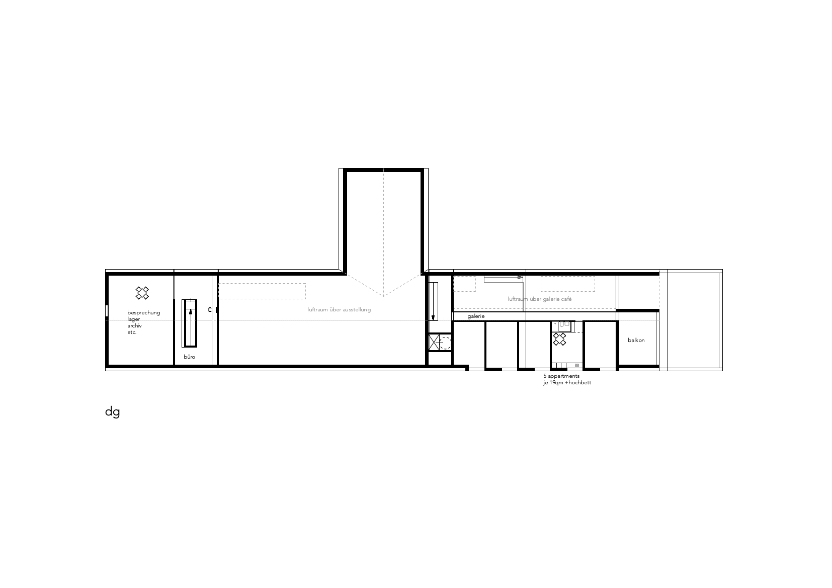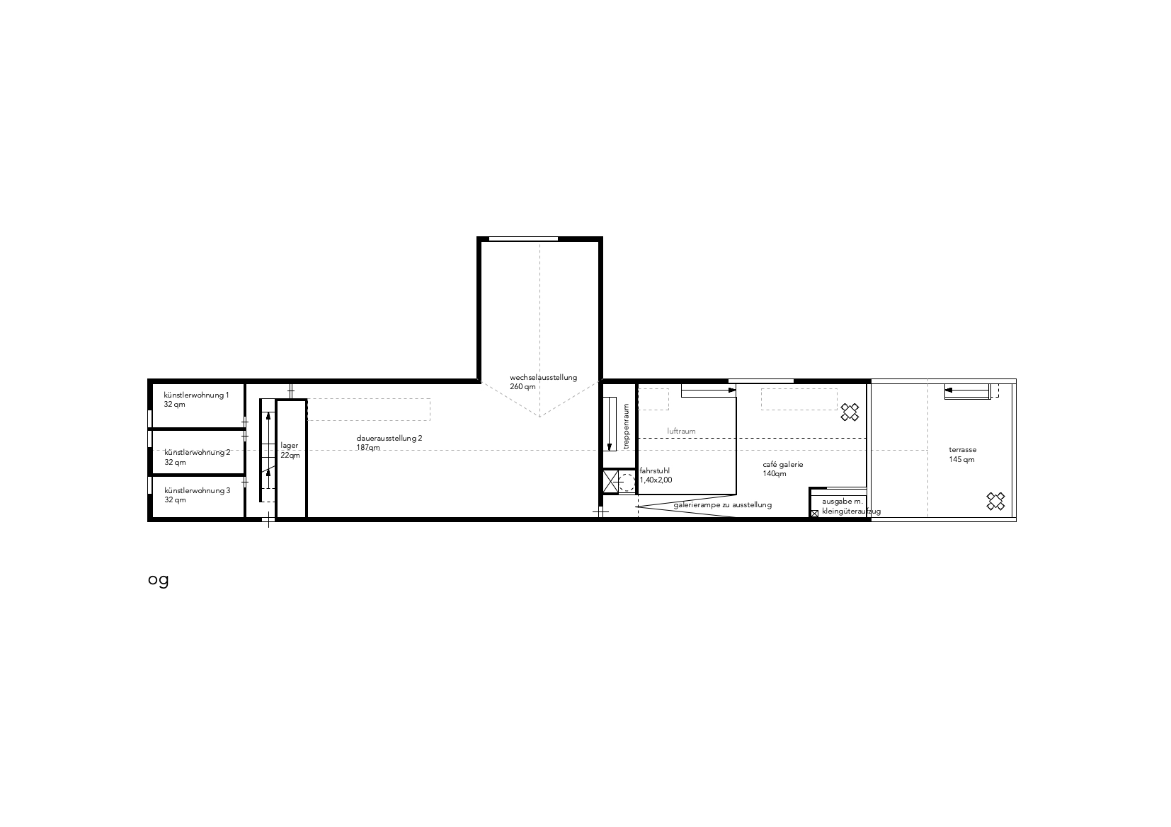 Das Galeriegeschoss über dem Bistro geht über in die großzügige Terrasse mit Blick über die Landschaft, und verfügt über direkten Zugang zu den hallenartigen Ausstellungs- und Veranstaltungsräumen. Insgesamt entstehen auf zwei Ebenen 900qm zur flexiblen Nutzung für dauerhafte und temporäre Ausstellungsformate. Drei Appartments mit Gemeinschaftsatelier dienen als Künstlerwohnungen für Austausch- und Stipendiatenprogramme.